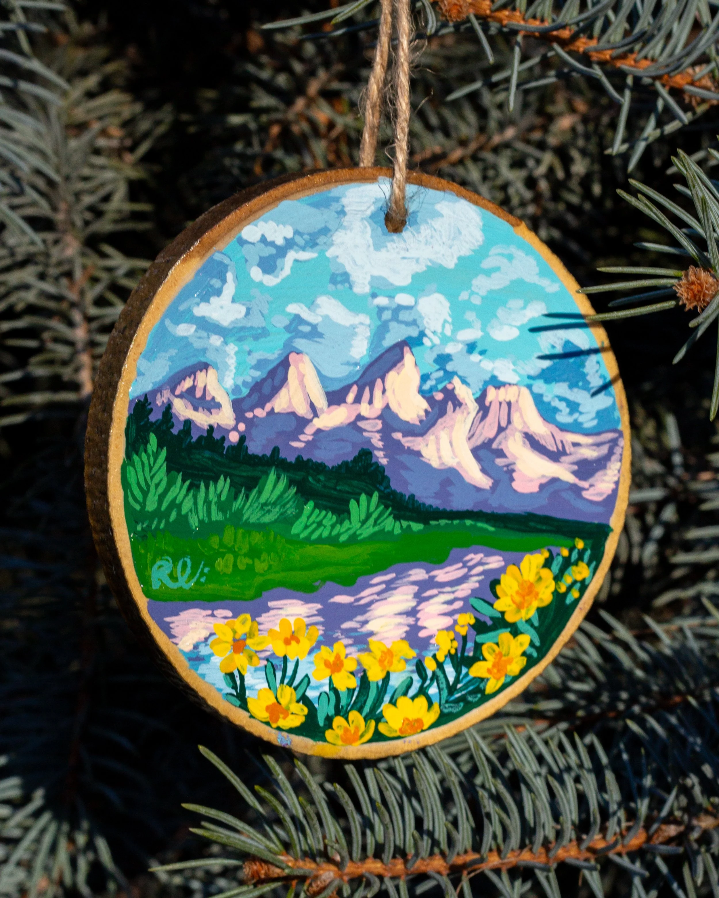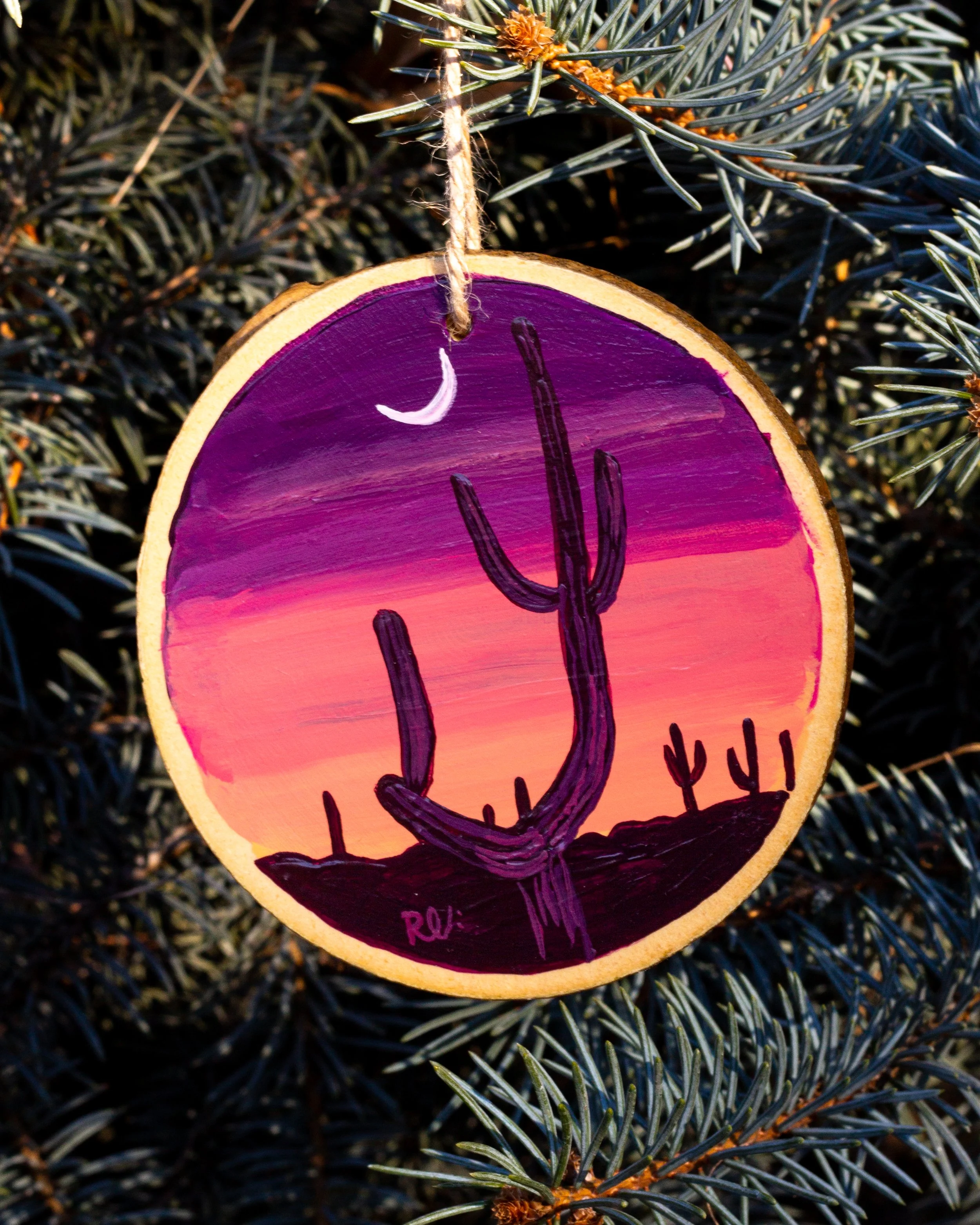 This one of a kind, original piece of artwork is hand painted on a natural edged birch wood round, signed by the artist, and sealed with a clear coat to ensure it lasts as long as your traditions. Hang it on your tree or your wall year round.